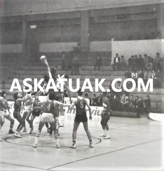 Juanma Isasa lucha por el balón en el salto inicial con Mikel Galdona, Josean Aldalur, Fernando Galilea y Luis Oyono en el quinteto inicial de Askatuak.